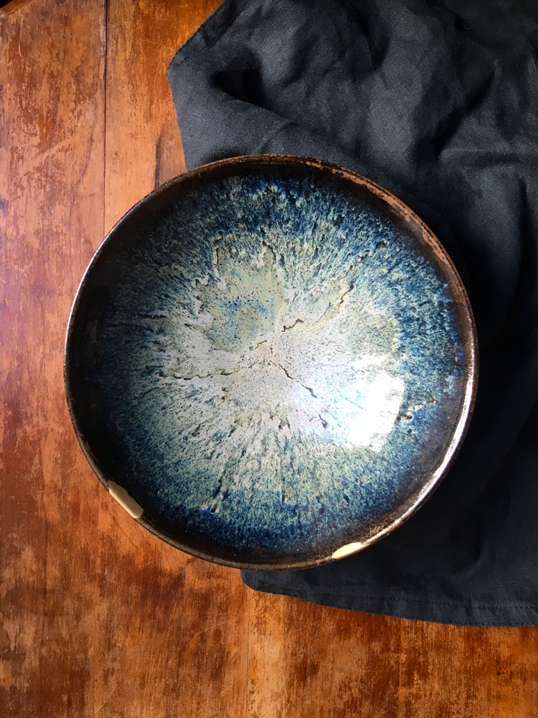 Grande assiette creuse de chez Marion Graux, fendue et réparée au kintsugi. 2023