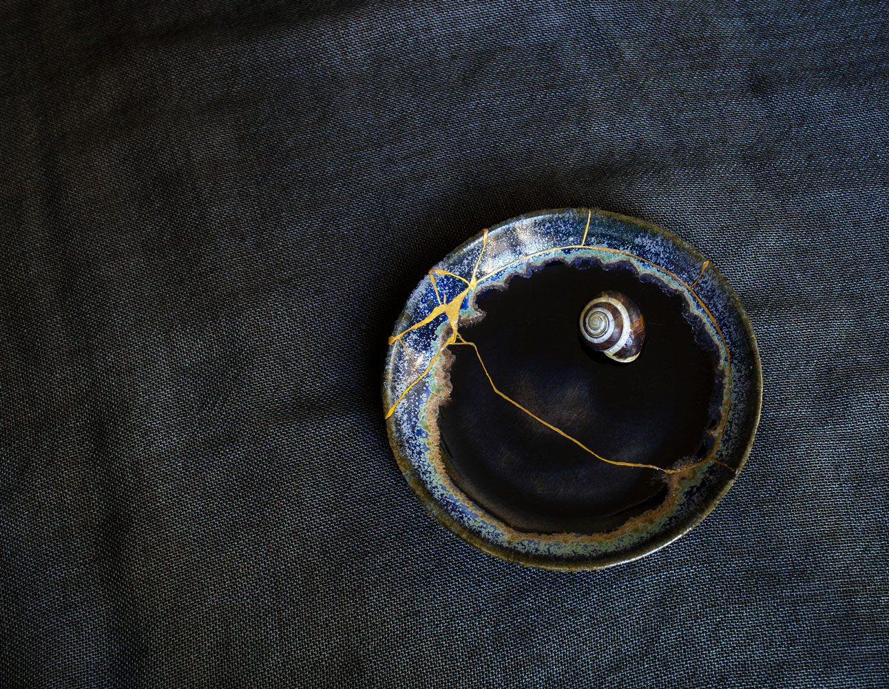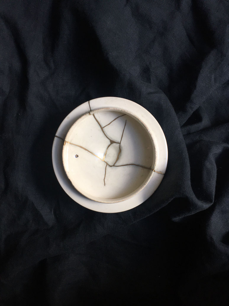 Réparation au Kintsugi d'une coupelle, XXIe siècle. Le Kintsugi est une méthode japonaise de réparation des porcelaines ou céramiques brisées au moyen de laque saupoudrée de poudre d'or, de bronze ou d'argent. Le Kintsugi invite à souligner plutôt qu'à masquer les imperfections, les fêlures de l'objet, transformer les blessures et les rendre belles. Symbole de résilience, le Kintsugi s'inscrit dans la pensée Wabi-sabi, l'art de mettre en lumière la beauté qui réside dans les choses simples, imparfaites et qui portent les empreintes du temps.