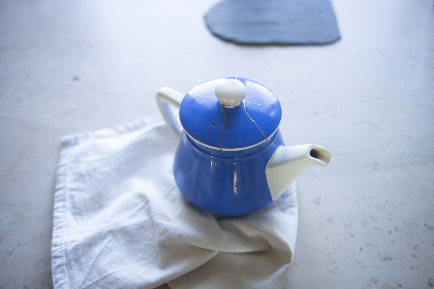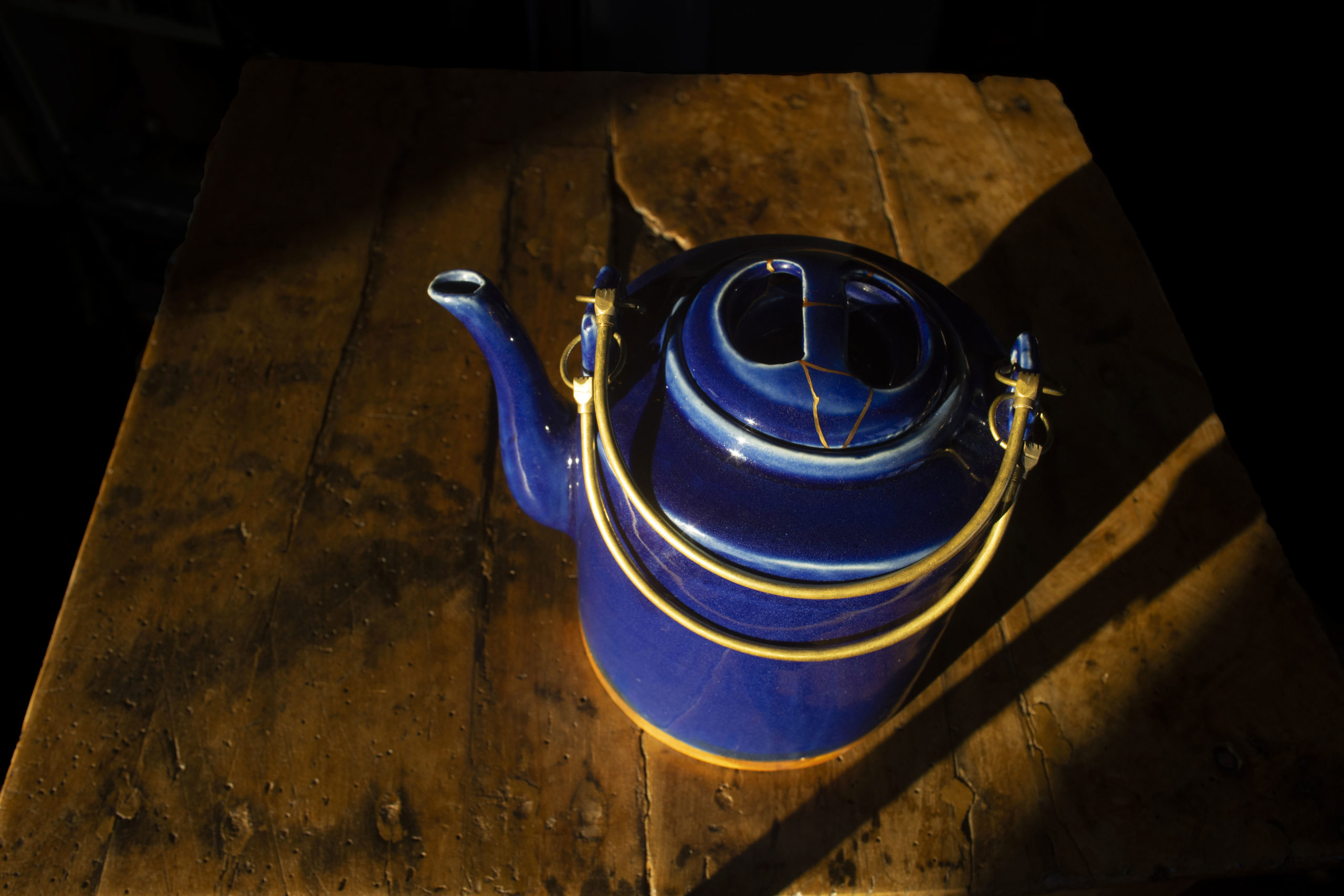Réparation au Kintsugi sur théière émaillée. Le Kintsugi est une méthode japonaise de réparation des porcelaines ou céramiques brisées au moyen de laque saupoudrée de poudre d'or, de bronze ou d'argent. Le Kintsugi invite à souligner plutôt qu'à masquer les imperfections, les fêlures de l'objet, transformer les blessures et les rendre belles. Symbole de résilience, le Kintsugi s'inscrit dans la pensée Wabi-sabi, l'art de mettre en lumière la beauté qui réside dans les choses simples, imparfaites et qui portent les empreintes du temps.