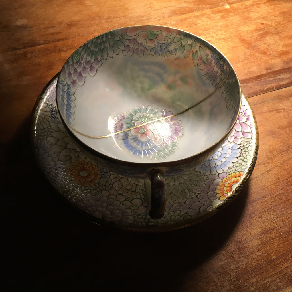 Réparation au Kintsugi sur porcelaine anglaise. Le Kintsugi est une méthode japonaise de réparation des porcelaines ou céramiques brisées au moyen de laque saupoudrée de poudre d'or, de bronze ou d'argent. Le Kintsugi invite à souligner plutôt qu'à masquer les imperfections, les fêlures de l'objet, transformer les blessures et les rendre belles. Symbole de résilience, le Kintsugi s'inscrit dans la pensée Wabi-sabi, l'art de mettre en lumière la beauté qui réside dans les choses simples, imparfaites et qui portent les empreintes du temps.