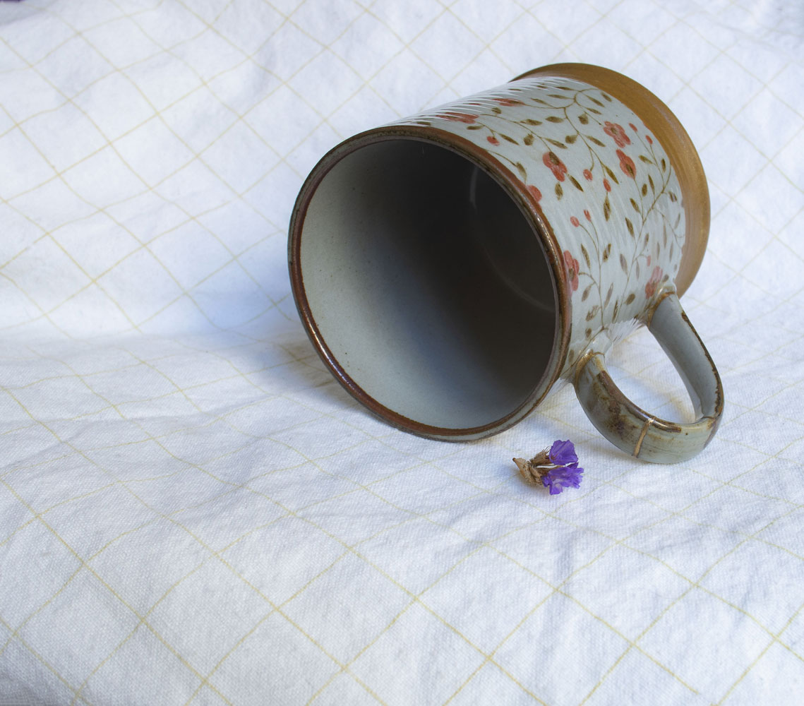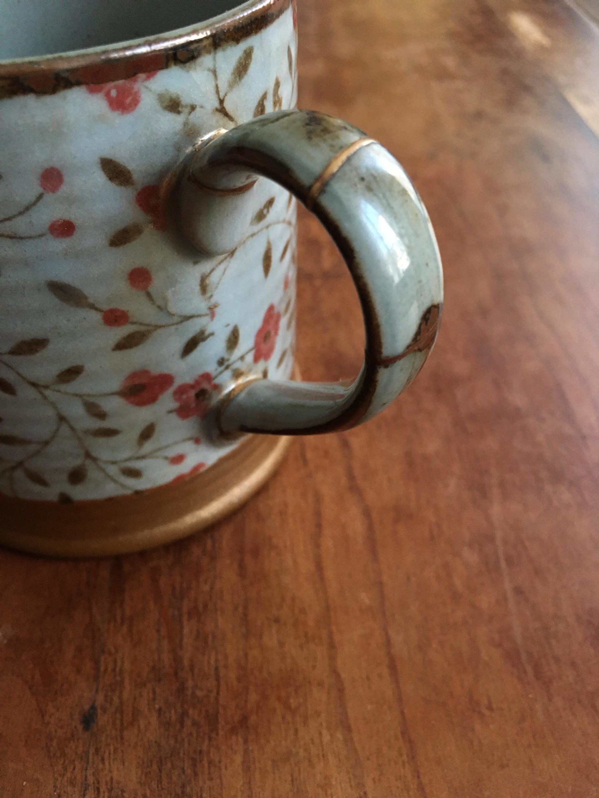 Réparation au Kintsugi de l'anse d'une tasse, XXIe siècle. Le Kintsugi est une méthode japonaise de réparation des porcelaines ou céramiques brisées au moyen de laque saupoudrée de poudre d'or, de bronze ou d'argent. Le Kintsugi invite à souligner plutôt qu'à masquer les imperfections, les fêlures de l'objet, transformer les blessures et les rendre belles. Symbole de résilience, le Kintsugi s'inscrit dans la pensée Wabi-sabi, l'art de mettre en lumière la beauté qui réside dans les choses simples, imparfaites et qui portent les empreintes du temps.