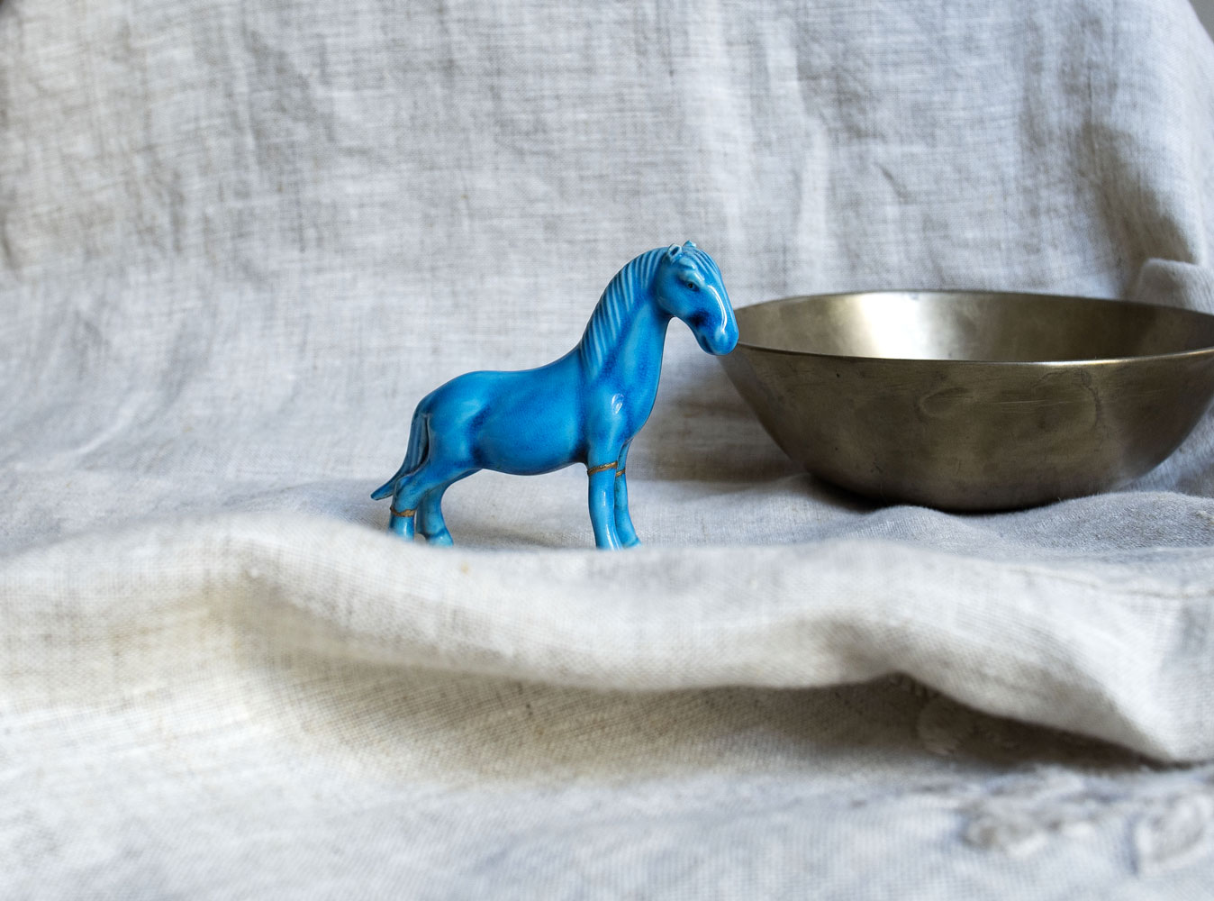 Réparation au Kintsugi d'une figurine en porcelaine chinoise d'un petit cheval bleu, XXe siècle. Le Kintsugi est une méthode japonaise de réparation des porcelaines ou céramiques brisées au moyen de laque saupoudrée de poudre d'or, de bronze ou d'argent. Le Kintsugi invite à souligner plutôt qu'à masquer les imperfections, les fêlures de l'objet, transformer les blessures et les rendre belles. Symbole de résilience, le Kintsugi s'inscrit dans la pensée Wabi-sabi, l'art de mettre en lumière la beauté qui réside dans les choses simples, imparfaites et qui portent les empreintes du temps.