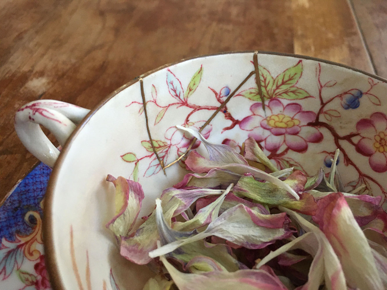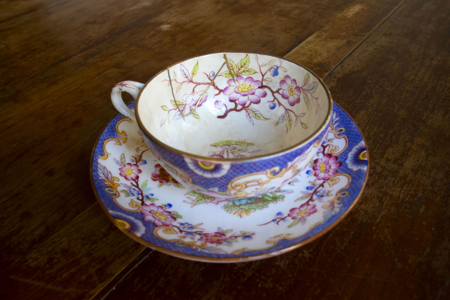 Réparation au Kintsugi sur porcelaine service Mille Fleurs, fin XIXe. Le Kintsugi est une méthode japonaise de réparation des porcelaines ou céramiques brisées au moyen de laque saupoudrée de poudre d'or, de bronze ou d'argent. Le Kintsugi invite à souligner plutôt qu'à masquer les imperfections, les fêlures de l'objet, transformer les blessures et les rendre belles. Symbole de résilience, le Kintsugi s'inscrit dans la pensée Wabi-sabi, l'art de mettre en lumière la beauté qui réside dans les choses simples, imparfaites et qui portent les empreintes du temps.