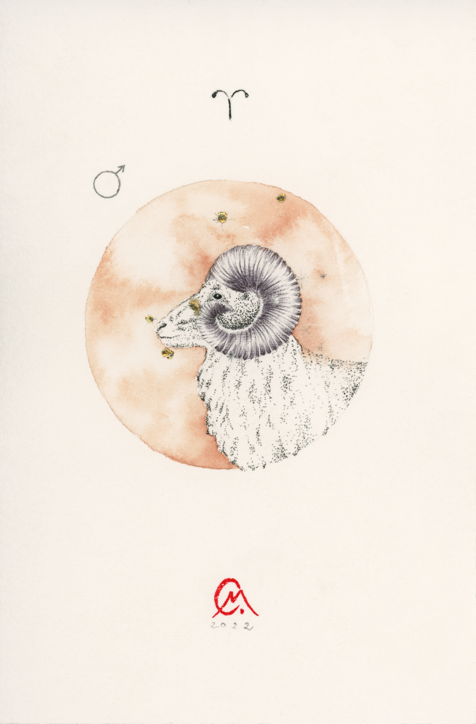 Petit Zodiaque - Bélier Aquarelle, encre de chine, stylo à bille et feuille d'or 22 carats