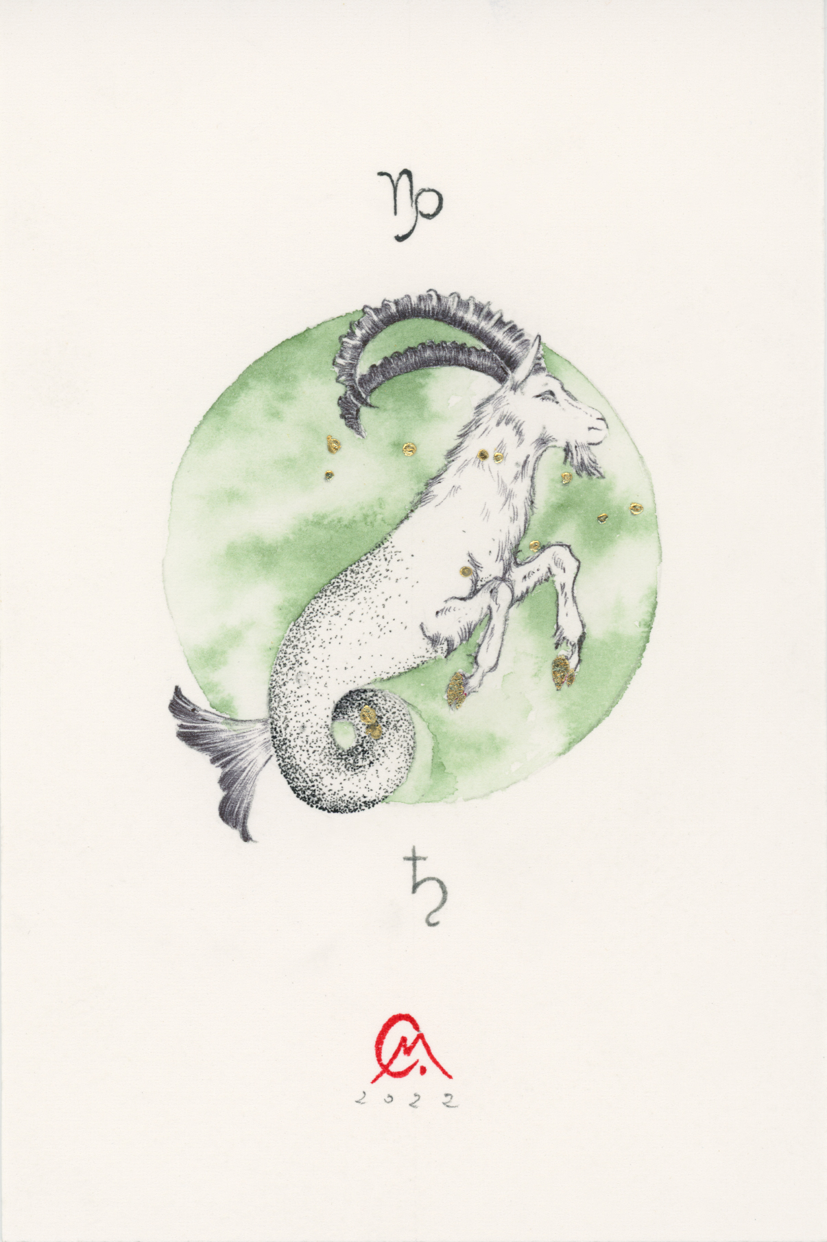 Petit Zodiaque - Capricorne Aquarelle, encre de chine, stylo à bille et feuille d'or 22 carats