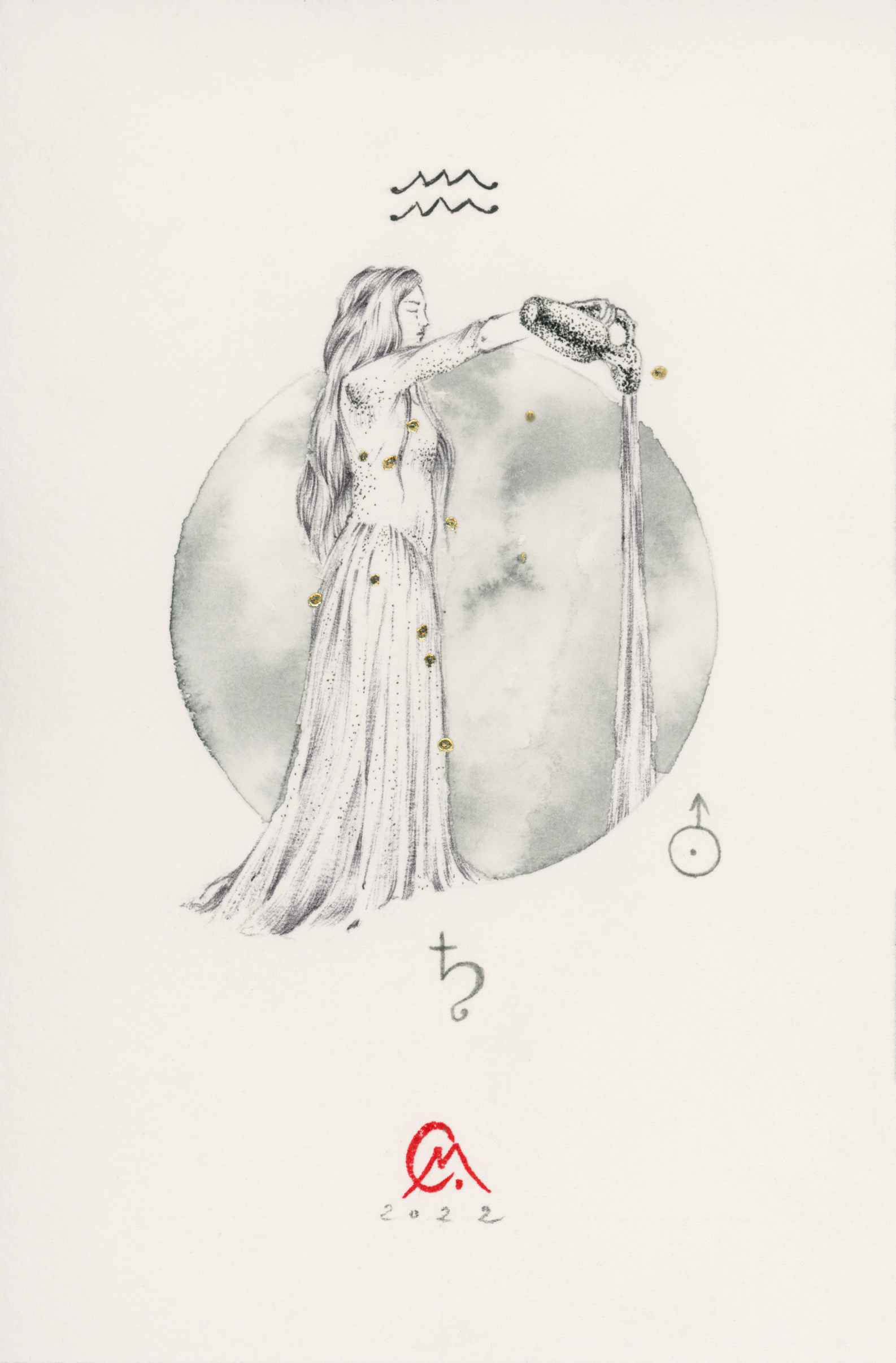 Petit Zodiaque - Verseau Aquarelle, encre de chine, stylo à bille et feuille d'or 22 carats