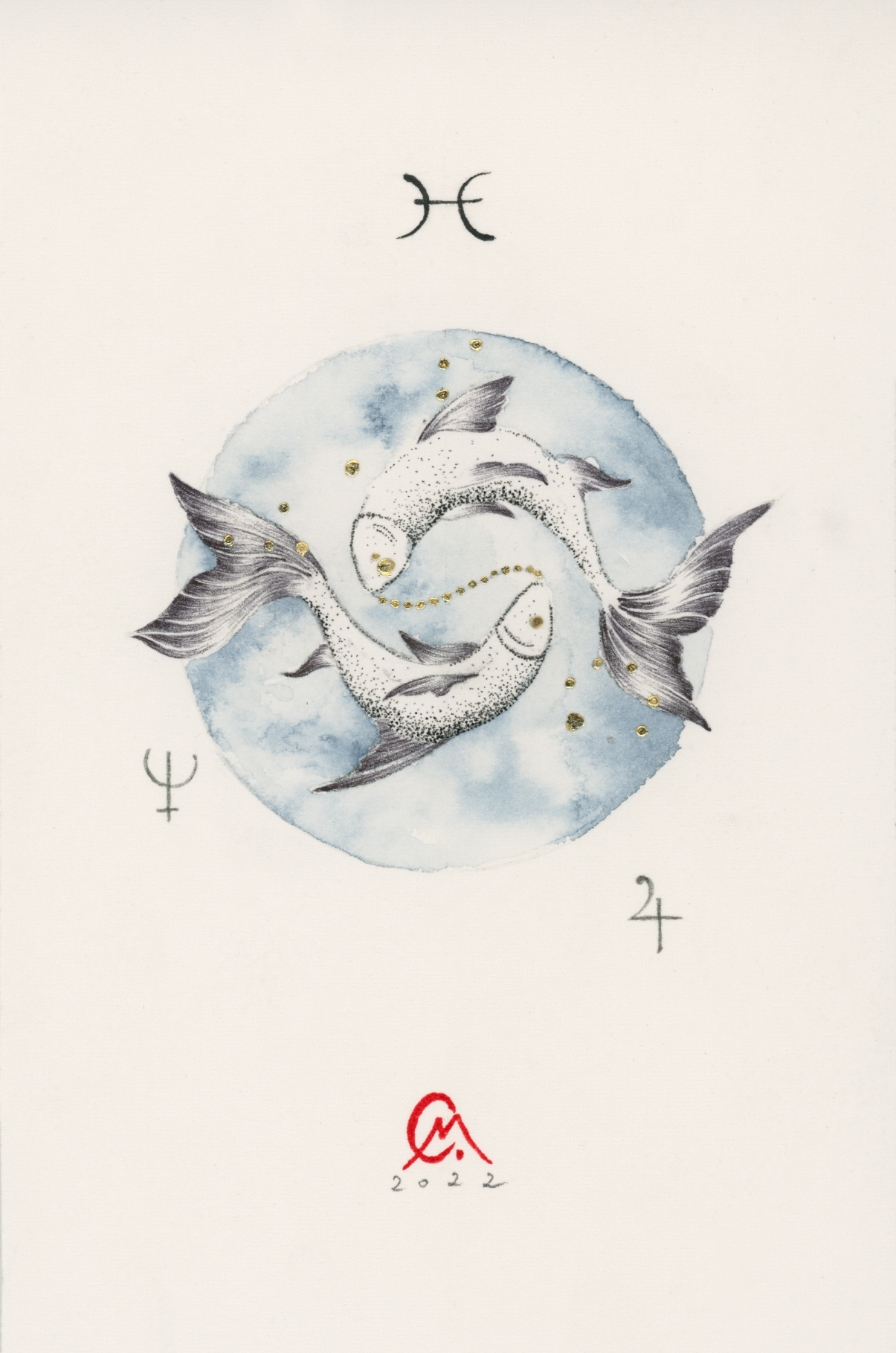 Petit Zodiaque - Poissons Aquarelle, encre de chine, stylo à bille et feuille d'or 22 carats