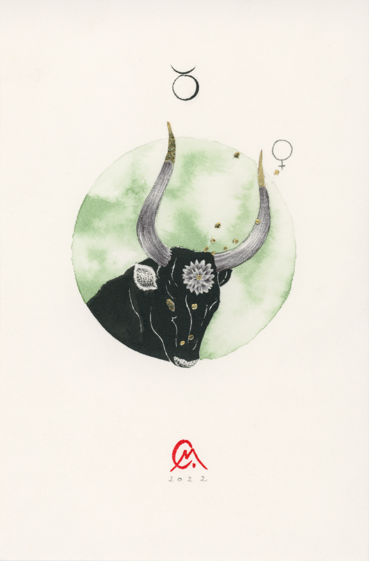 Petit Zodiaque - Taureau Aquarelle, encre de chine, stylo à bille et feuille d'or 22 carats