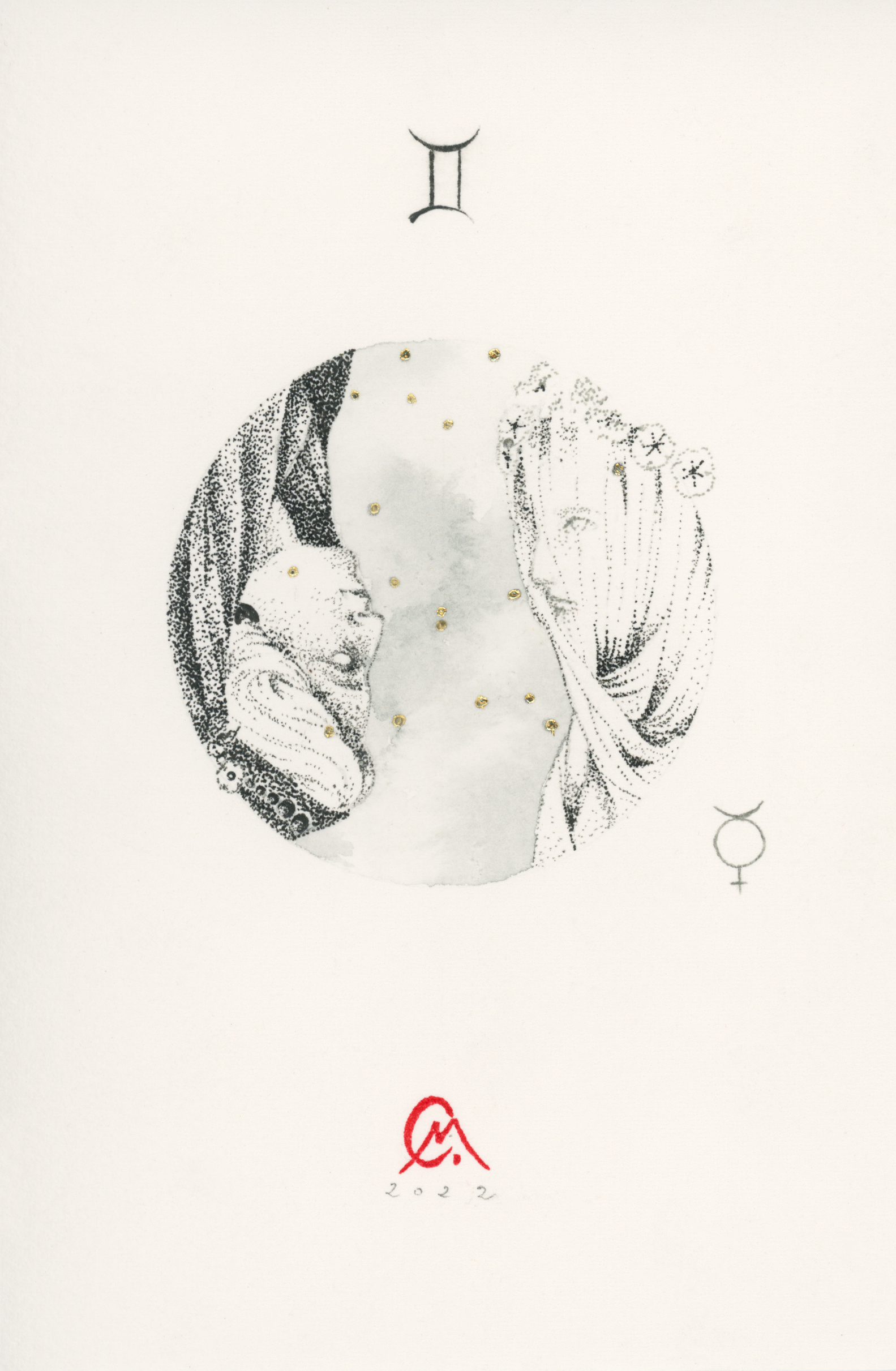Petit Zodiaque - Gémeaux Aquarelle, encre de chine, stylo à bille et feuille d'or 22 carats