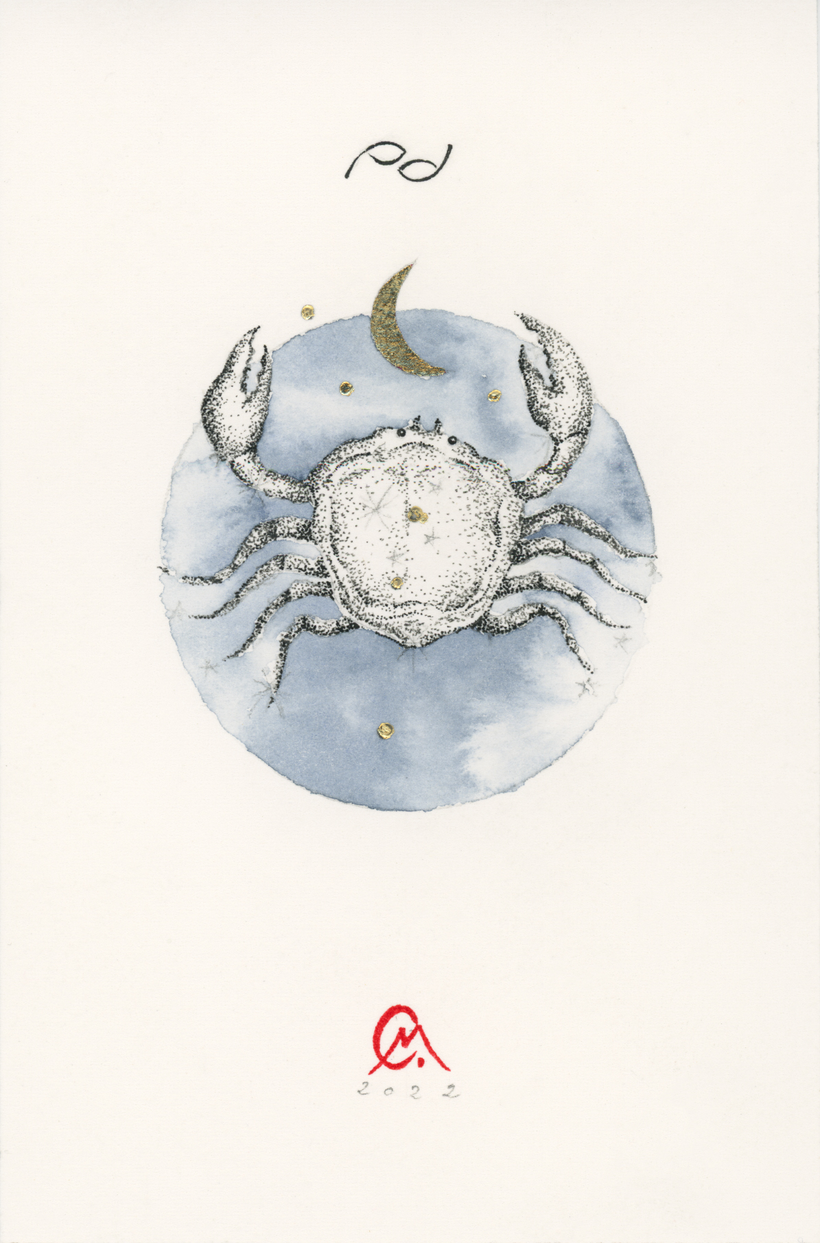 Petit Zodiaque - Cancer Aquarelle, encre de chine, stylo à bille et feuille d'or 22 carats