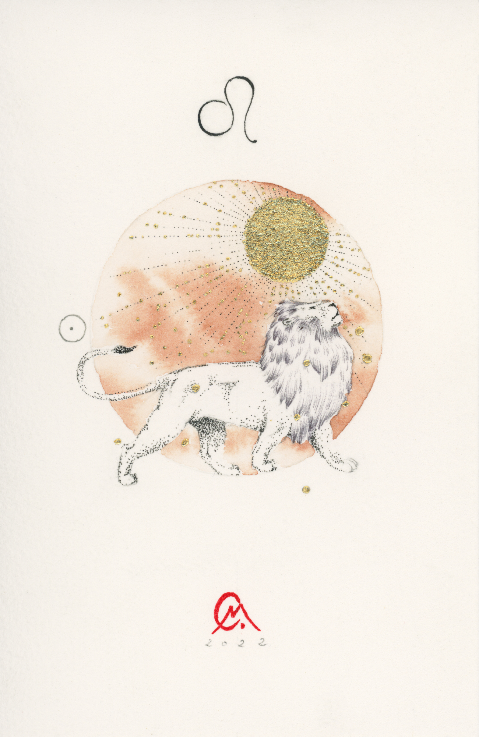 Petit Zodiaque - Lion Aquarelle, encre de chine, stylo à bille et feuille d'or 22 carats