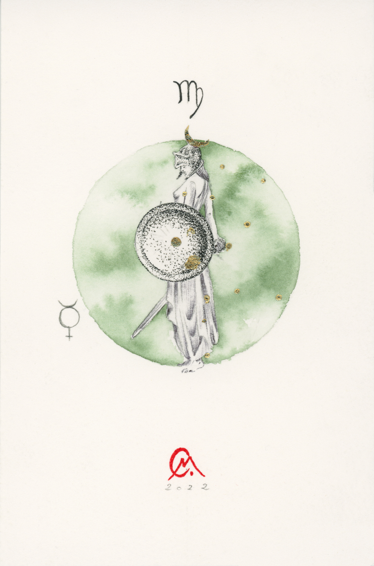 Petit Zodiaque - Vierge Aquarelle, encre de chine, stylo à bille et feuille d'or 22 carats