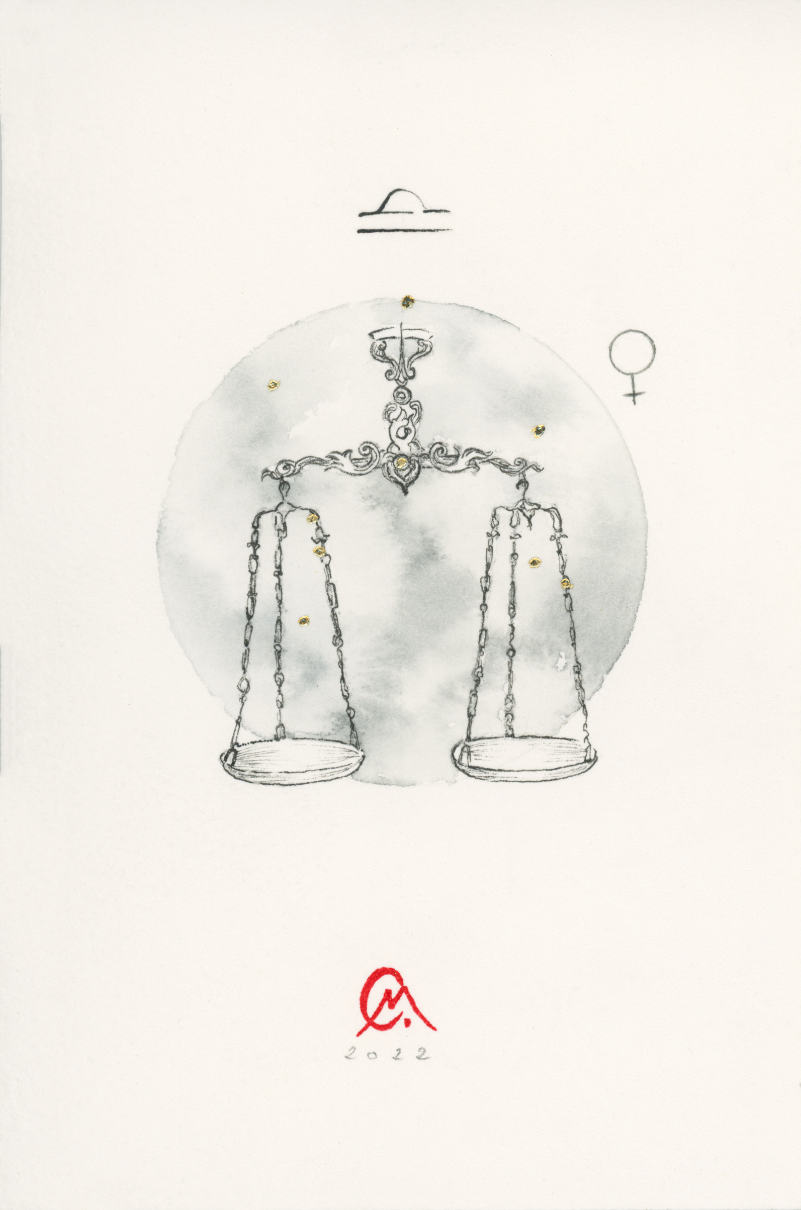 Petit Zodiaque - Balance Aquarelle, encre de chine, stylo à bille et feuille d'or 22 carats