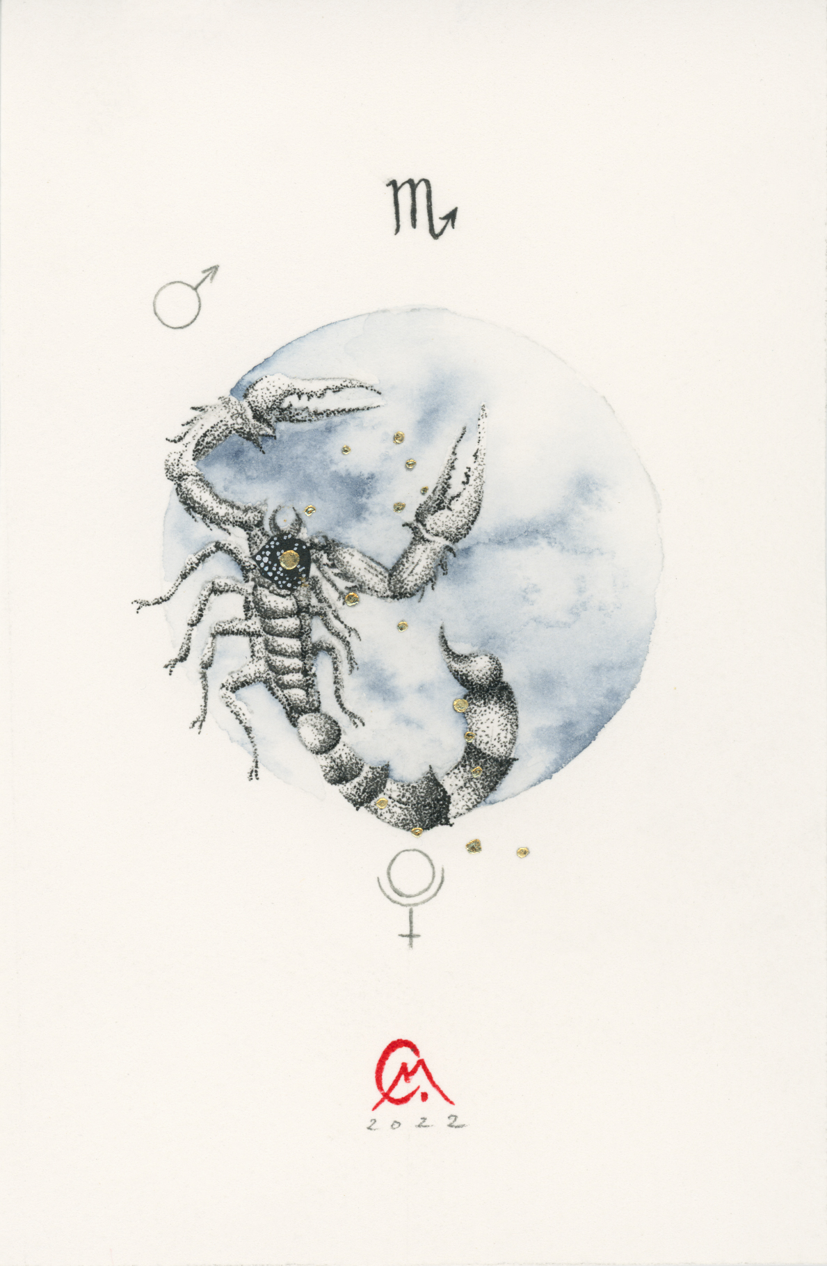 Petit Zodiaque - Scorpion Aquarelle, encre de chine, stylo à bille et feuille d'or 22 carats