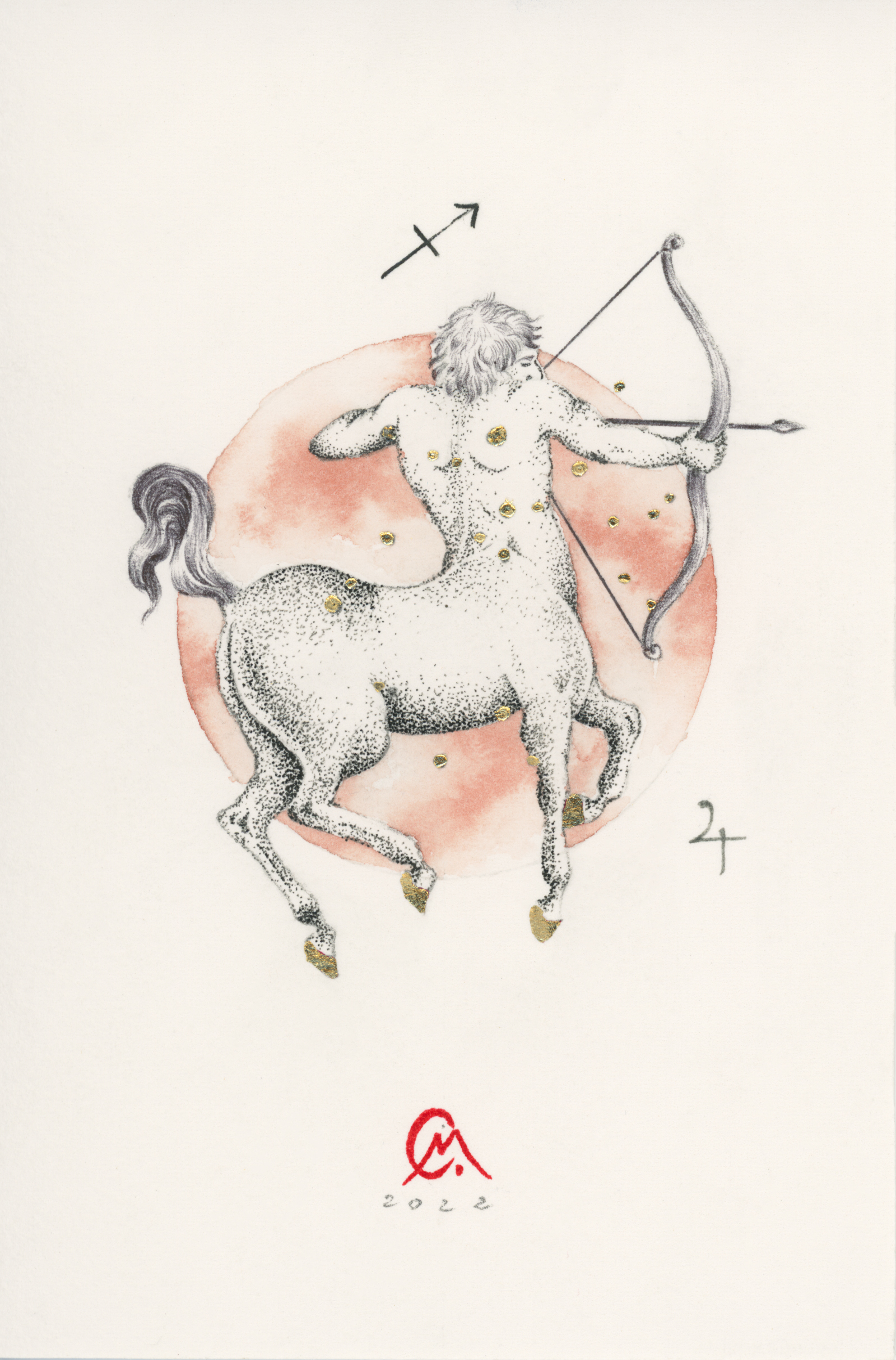 Petit Zodiaque - Sagitaire Aquarelle, encre de chine, stylo à bille et feuille d'or 22 carats